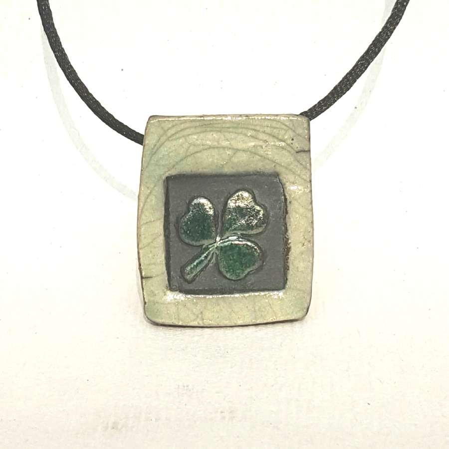 Jade green shamrock with celadon frame on an adjustable satin cord 1.25″ x 1.75″